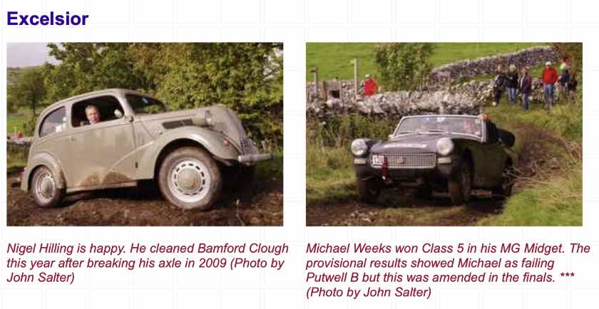 Litton should have been after the break. It was for the motorcyclists but not the traditional section which is not available. The hill was approached through by turning off the main road at the Anglers Rest and following the river valley to Litton Mill. Then, from approximately the usual start line, the hill went up the normal approach road before picking up the grassy Class 0 section and finishing in the usual place. The bikes were OK and so were the initial experienced competitors in well prepared cars. Unfortunately the earlier delays meant that some Class 0 cars were running towards the head of the four wheeled brigade. Several had problems getting to section begins and nervous of PR issues the Chief Official called a halt to proceedings. Julian Lack and David Bache were amongst the lucky few to get an attempt and reported it was a good section.