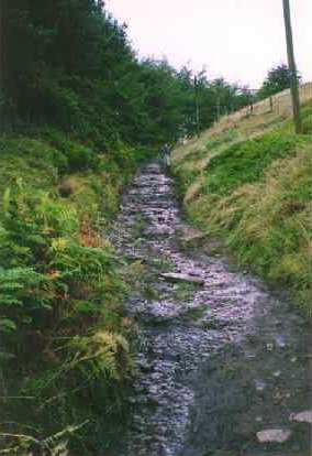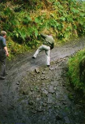 After the 1993 Edinburgh Jonathan, Pat, Derek and I walked the section and I bemoaned the fact that class 3 didn’t get a shot at it. I have since gone up it twice in the Marlin and my propshaft tunnel has the scars to prove it. I attach some photos I took that day. The first shows the section from across the valley, The second the infamous first corner with Derek having a little trouble on the restart and the other two the rocky steps in the upper reaches.”