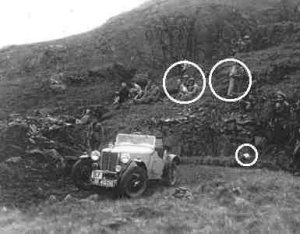 Then Kevin Barnes e-mailed me “Just seen the Jenkins Chapel debate and thought I would try and help. I think that (99% sure) the picture may actually be of Wrynose Pass on the London-Edinburgh. I enclose a picture of my grandfather J.D.Barnes on this section. (wrynose.jpg) It’s not as good quality as the MG picture but after studying it at high zoom levels I believe that some of the people and features in the background are the same as in the MG picture. I have highlighted them on the MG . I will have a look at the competition numbers for that trial to see if I am right when I get time.