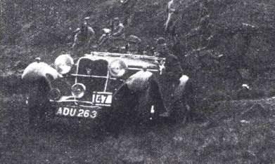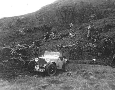 A few days later Andrew Brown came back to me after some considerable research. “I don’t where you got the original photograph from, but it is on Page 34 of Roger Thomas’ excellent ‘M.G. Trials Cars’ book where it is captioned as “Lewis Welch in Athos on the 1935 M.C.C. One Day Sporting Trial in Derbyshire at the upper part of Jenkins Chapel”. The registration is clearly shown as JB 4606 and the competition number as 57. JB 4606 was one of the three MG NEs (1287cc) which ran in the 1934 TT, were converted to trials cars for a short period in 1935 when they ran as ‘The Three Musketeers’ team, and were then re-converted to race cars for the 1935 TT. According to Roger Thomas they entered only four trials (Lands End, Edinburgh, Abingdon, and Rushmere) and the Welsh Rally. Donald Cowbourne’s book lists Welch in a 1287cc MG Magnette in both the Lands End (No.399) and the Edinburgh (No.57), and in a 1408cc Magnette in the MCC Sporting (No.89). So, unless there is some amazing coincidence, I think it’s a pretty fair assumption that the picture was taken on the 1935 Edinburgh.